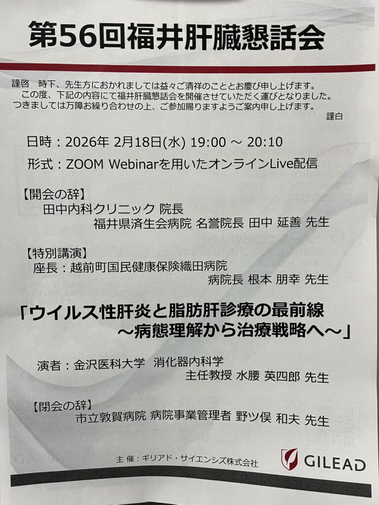 WEBで参加しました。ご講演頂いた水腰英四郎先生は小生が金沢大学附属病院消化器内科および同大学院に所属時に大変お世話になった先生です(現在は金沢医科大学病院消化器内科学教授)。主にMASLD(代謝機能障害関連脂肪性肝疾患、簡単に言えば脂肪肝由来の肝臓病)の基礎研究領域において講演頂きました。さすがに基礎研究領域の講演でしたのでやや難解な部分もありましたが、とても分かりやすく講演していただきました。