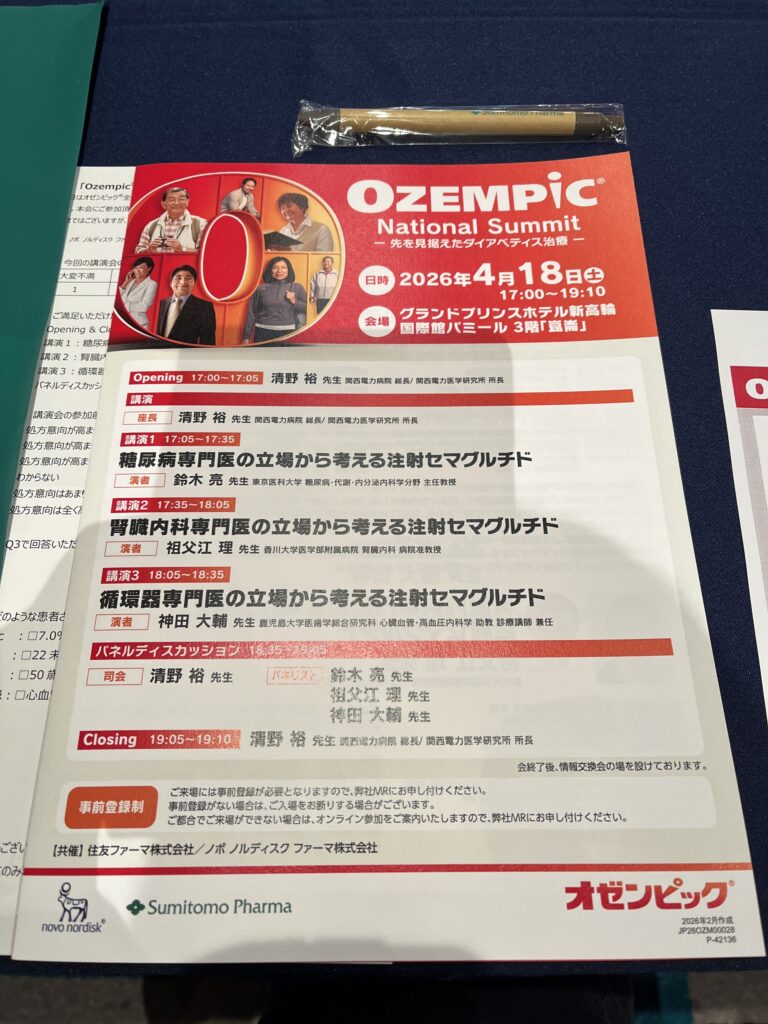 オゼンピック®をはじめ、GLP-1受容体作動薬は糖尿病のみならず、腎臓(慢性腎臓病:CKD)、心臓(心不全)、血管(末梢動脈疾患)そして肝臓(代謝機能障害関連脂肪肝疾患:MASLD)など多臓器に良い作用が期待できます。今回の講演は最近のトピックスも含めた有意義な内容でしたので、とても勉強なりました(感謝)。